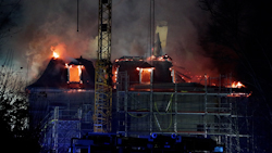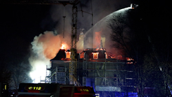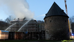 ANC-NEWS Velbert (Kreis Mettmann) - Am frühen Freitagmorgen (21.11.) wurde die Feuerwehr zu einem Brand am Schloss Hardenberg in Velbert alarmiert. Eine Streifenwagenbesatzung der Polizei bemerkte einen Feuerschein im Herrenhaus und alarmierte gegen 04:30 Uhr die Feuerwehr. Bei Eintreffen der ersten Einsatzkräfte war eine massive Rauchentwicklung zu erkennen, und kurze Zeit später stand der Dachstuhl im Vollbrand. Trotz eines sofort eingeleiteten, massiven Löschangriffs stand das Gebäude nach kurzer Zeit komplett in Flammen. Wegen einer möglichen Einsturzgefahr des Dachstuhls wurden Facharbeiter vom THW zur Begutachtung des historischen Schlosses aus dem 17. Jahrhundert hinzugezogen. Eine Drohne wurde eingesetzt, um weitere Glutnester zu finden und abzulöschen. Wegen der starken Rauchentwicklung und Geruchsbelästigung wurde die Warn-App NINA ausgelöst. Anwohner wurden aufgefordert, Fenster und Türen geschlossen zu halten. Die Nachlöscharbeiten werden voraussichtlich noch bis zum Mittag andauern.