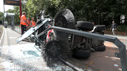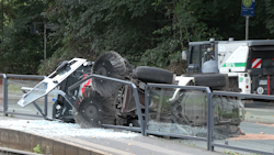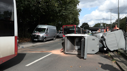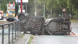 ANC-NEWS Duisburg - An der Bushaltestelle Theodor-Heuss-Straße hat es am Dienstagvormittag (2. September, 11:10 Uhr) einen Unfall mit zwei Kehrmaschinen und einem Linienbus gegeben. Nach bisherigem Kenntnisstand waren die beiden Reinigungsfahrzeuge hintereinander auf der Duisburger Straße unterwegs. Der Fahrer der vorderen Kehrmaschine (50) bremste ab, um einem stehenden Linienbus auszuweichen. Der nachfolgende Fahrer (ebenfalls 50) konnte nicht mehr rechtzeitig stoppen und fuhr auf das vorausfahrende Fahrzeug auf. Durch den Aufprall wurde die erste Kehrmaschine auf die linke Fahrspur gedrückt und kippte auf die Seite. Dabei zerbrach eine Glasscheibe der Haltestelle. Die zweite Kehrmaschine prallte im Anschluss gegen den Linienbus. Der 50-jährige Fahrer des hinteren Fahrzeugs verletzte sich bei dem Zusammenstoß leicht und wurde vor Ort von Rettungssanitätern behandelt. Sein Arbeitskollege blieb zwar äußerlich unverletzt, stand jedoch unter Schock. Der Busfahrer (59) und Fahrgäste kamen ohne Verletzungen davon. Die umgekippte Kehrmaschine war nicht mehr fahrbereit und musste abgeschleppt werden. Das Verkehrskommissariat 21 hat die Ermittlungen zur genauen Unfallursache aufgenommen. Quelle: Polizei Duisburg
