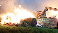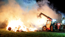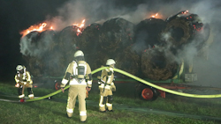 Rundballen mit Teleskoplader auseinandergezogen - NINA-Warnung ausgelöst - Lange Wegstrecke für Wasserversorgung aufgebaut