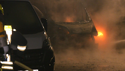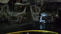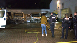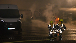 ANC-NEWS Oberhausen - In der Nacht zum Mittwoch (22.10.) brannten auf dem Hof eines Gewerbebetriebes an der Duisburger Straße in Oberhausen mehrere Transporter aus bisher ungeklärter Ursache komplett aus. Drei Fahrzeuge brannten vollständig, weitere Transporter wurden durch die enorme Hitze in Mitleidenschaft gezogen. Die Feuerwehr konnte einen Übergriff der Flammen auf angrenzende Bereiche verhindern; eine Lagerhalle blieb zum Glück unbeschädigt. Die Polizei ermittelt in alle Richtungen und schließt eine Brandstiftung nach derzeitigen Erkenntnissen nicht aus. Der entstandene Sachschaden wird auf über 100.000 Euro geschätzt. Die Duisburger Straße war während der Löscharbeiten rund zwei Stunden voll gesperrt. Die Feuerwehr war mit 28 Kräften im Einsatz.