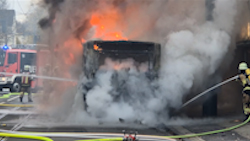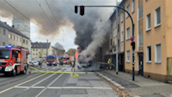 Meterhohe Flammen aus Bus - Bus befand sich auf Ausbildungsfahrt - Fensterscheiben an Wohnhaus geborsten - Massive Rauchsäule - Fahrer und Begleiter retten sich in Freie