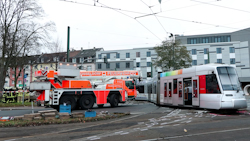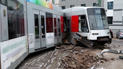ANC-NEWS Düsseldorf - Am frühen Mittwochmorgen (26.11.) gegen 05:40 Uhr kam es zu einem schweren Unfall mit einer Straßenbahn auf der Bonner Straße in Düsseldorf. Nach ersten Erkenntnissen ist eine Straßenbahn mit zwei Zügen vermutlich durch eine falsch gestellte Weiche an der Wendeschleife aus den Gleisen gesprungen. Dabei wurde der erste Zug gegen Straßenschilder, mindestens einen Mast und mehrere abgestellte Motorräder geschleudert, während der zweite Zug von der Kupplung gerissen wurde und mit dem ersten Zug kollidierte. Laut Feuerwehr gab es 16 betroffene Personen; acht davon wurden leicht und eine schwer verletzt. Die Bonner Straße musste für die Zeit der Bergungsarbeiten komplett gesperrt werden. Es kam zu erheblichen Verkehrsstörungen im morgendlichen Berufsverkehr. Die aufwendigen Bergungsarbeiten werden vermutlich noch bis zum Nachmittag andauern. Die Polizei hat die Ermittlungen zum genauen Unfallhergang eingeleitet.